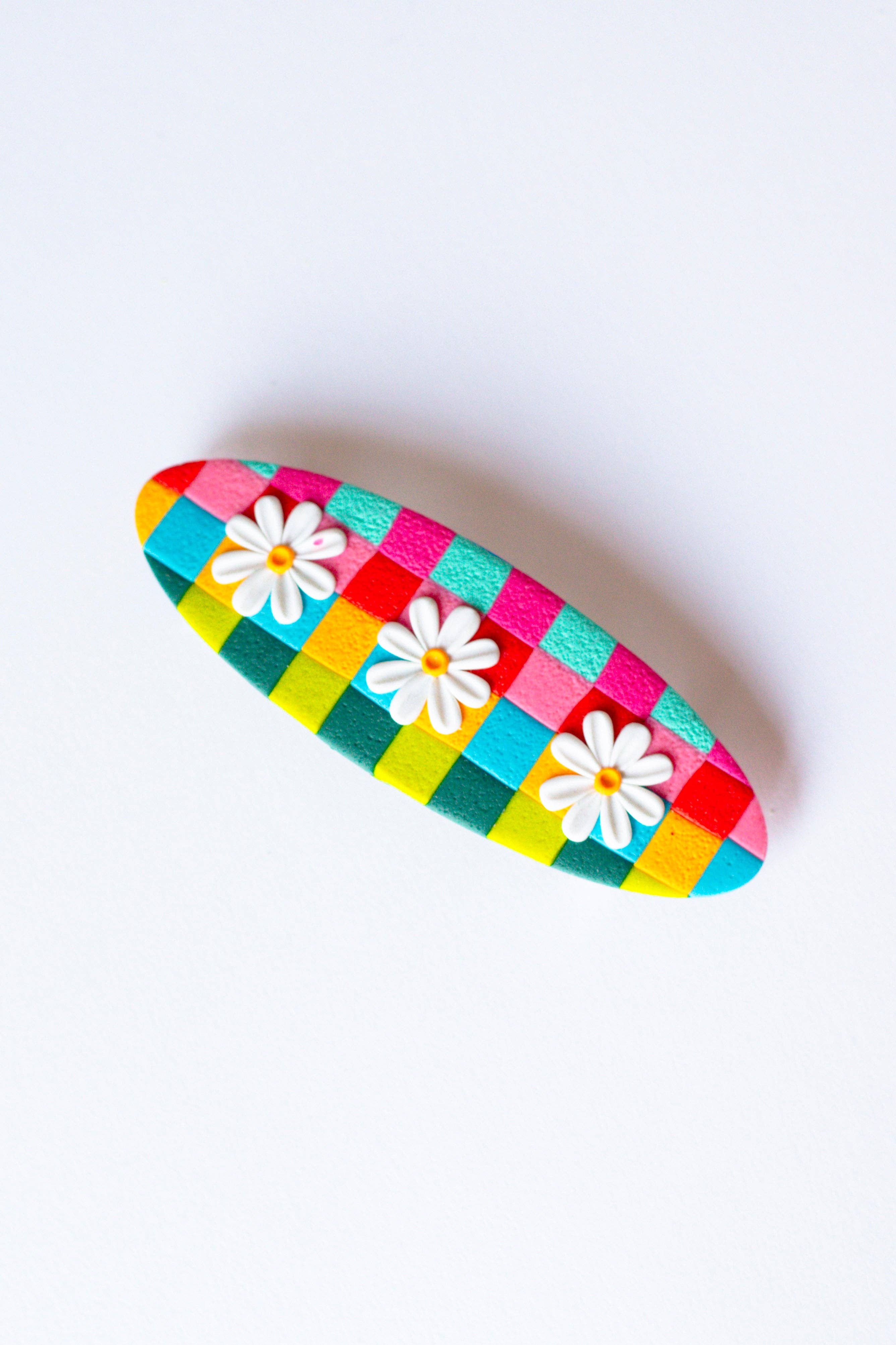 Slow Day Studios - Barrette à cheveux en pâte polymère arc-en-ciel à damier avec marguerite