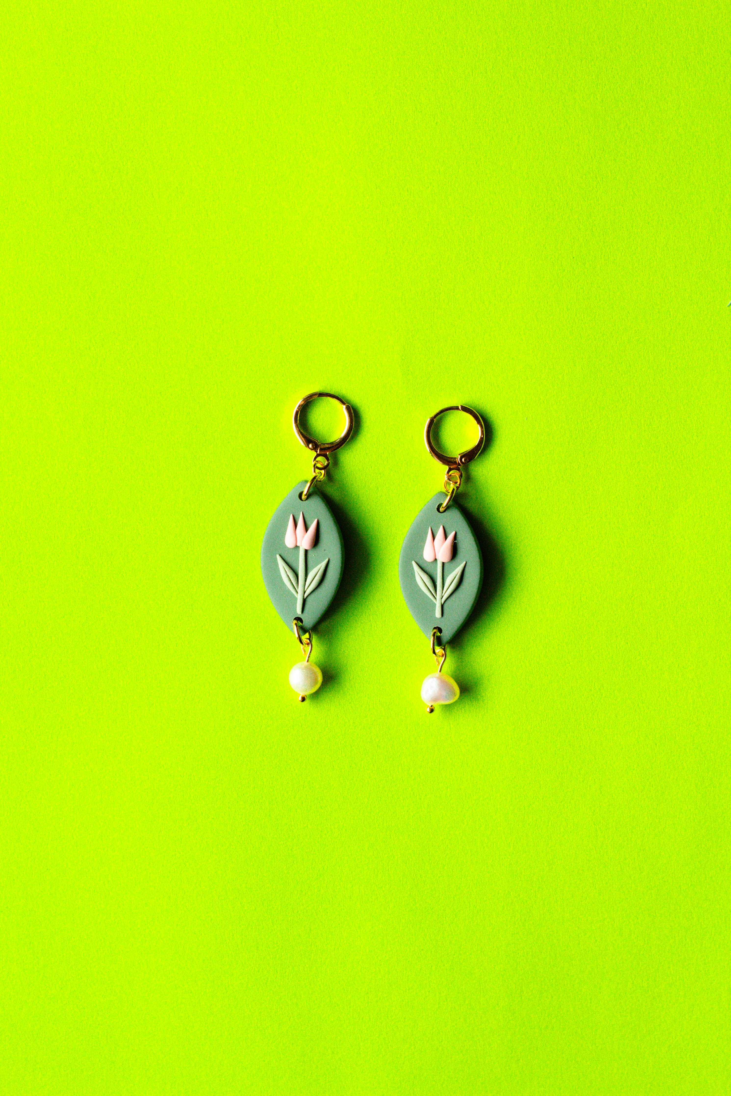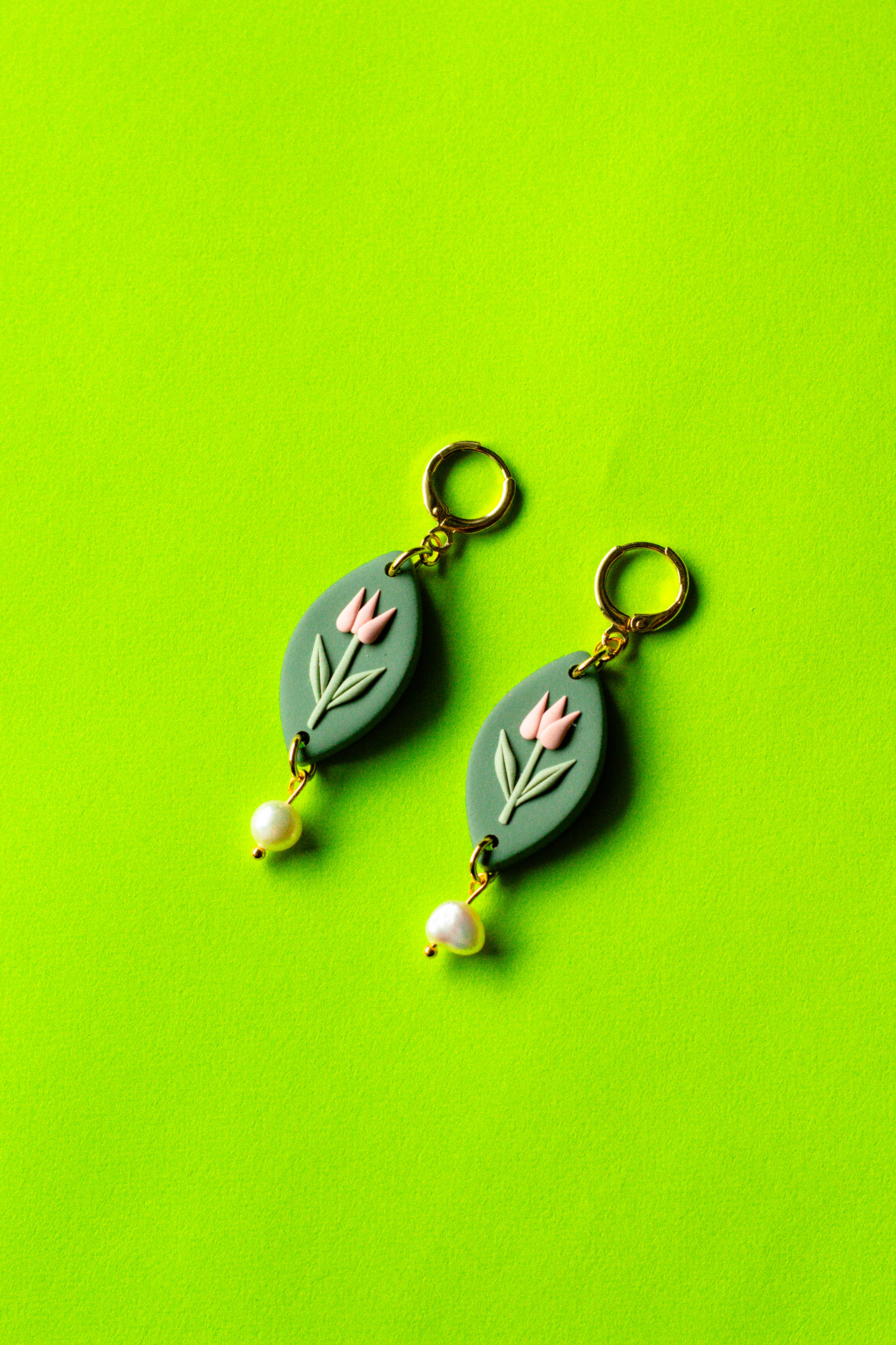 Slow Day Studios - Anneau Tulip Huggie Hoop avec perle d'eau douce, vert olive