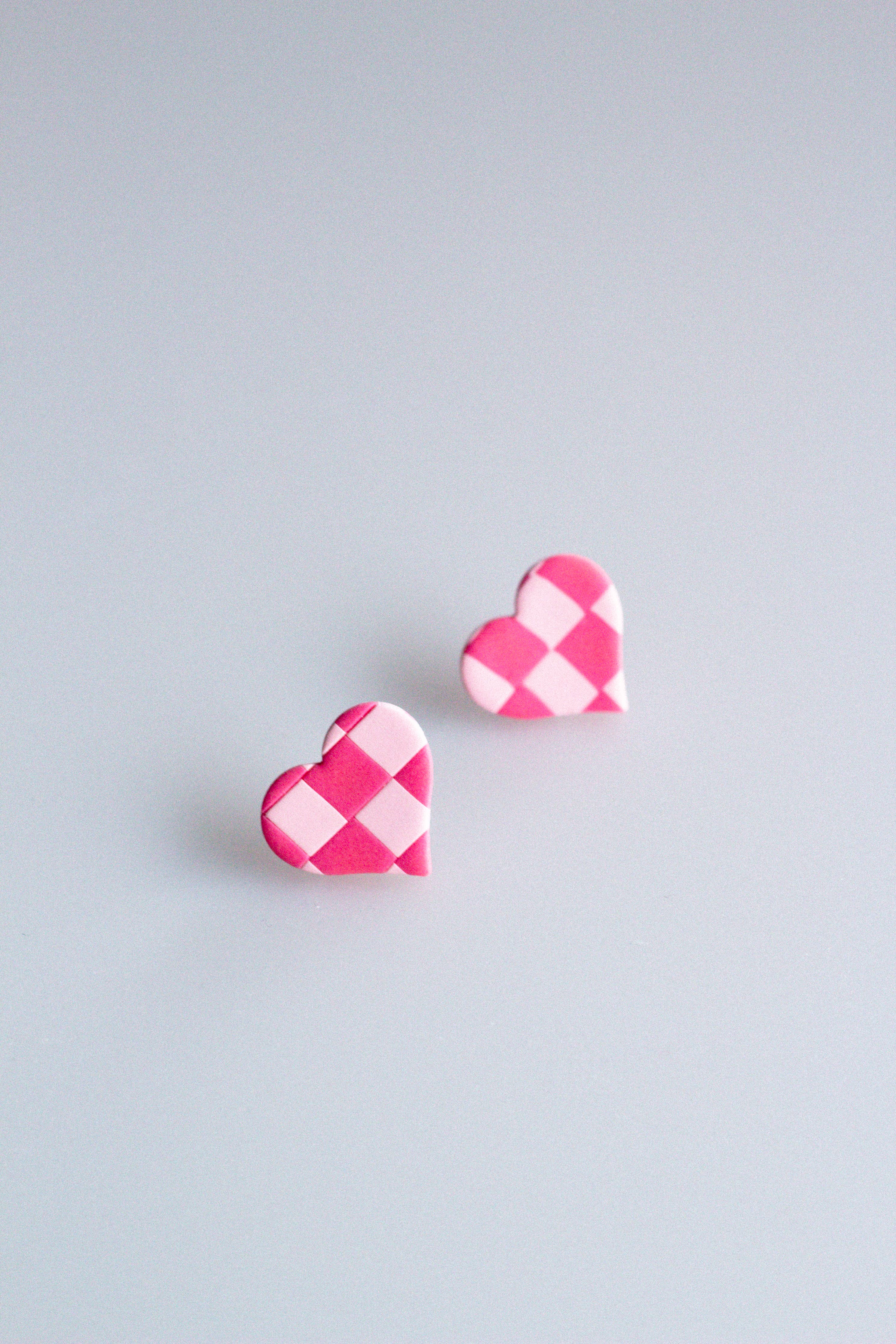 Slow Day Studios - Boucles d'oreilles clous cœur à damier rose en argile polymère